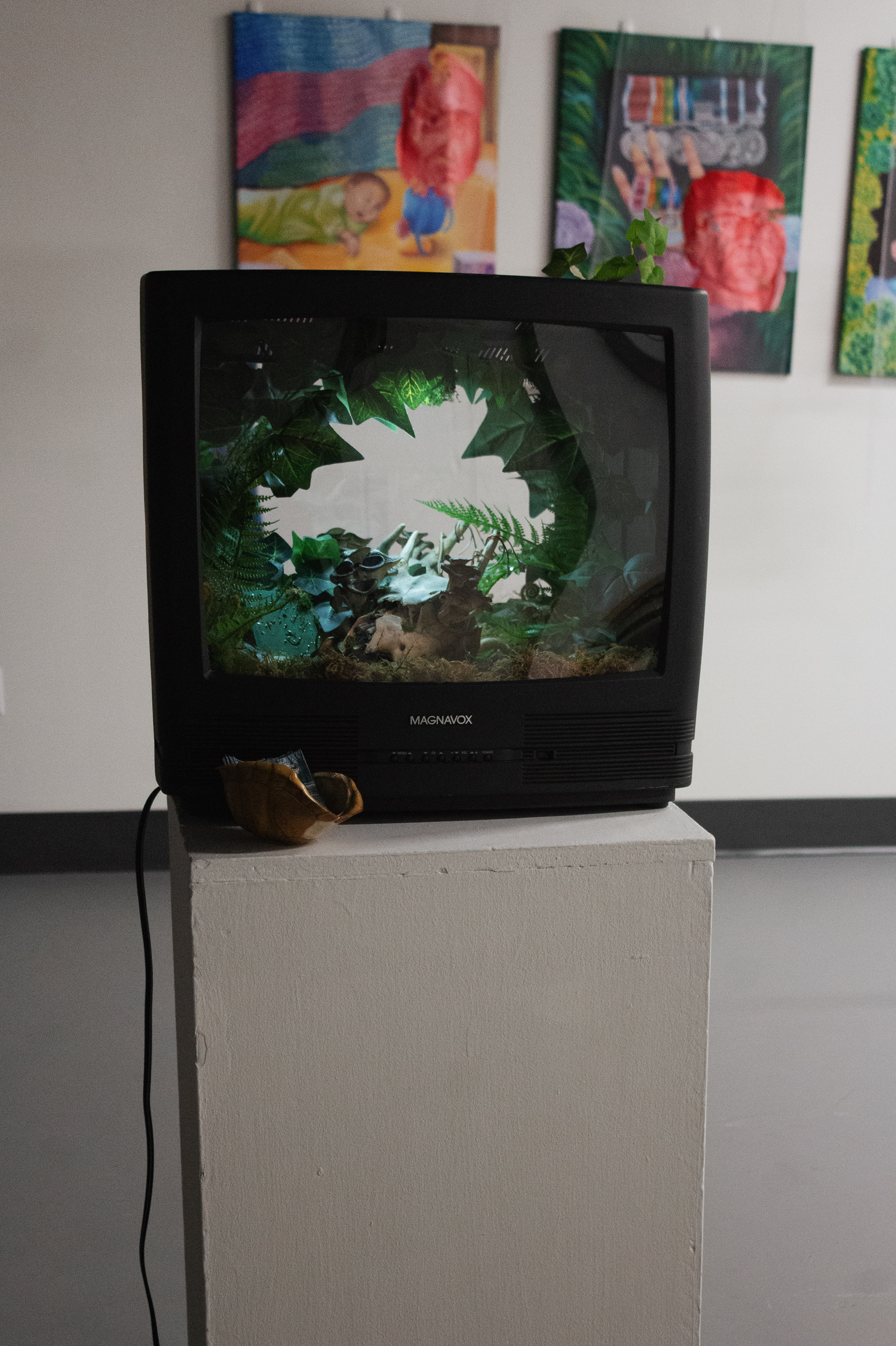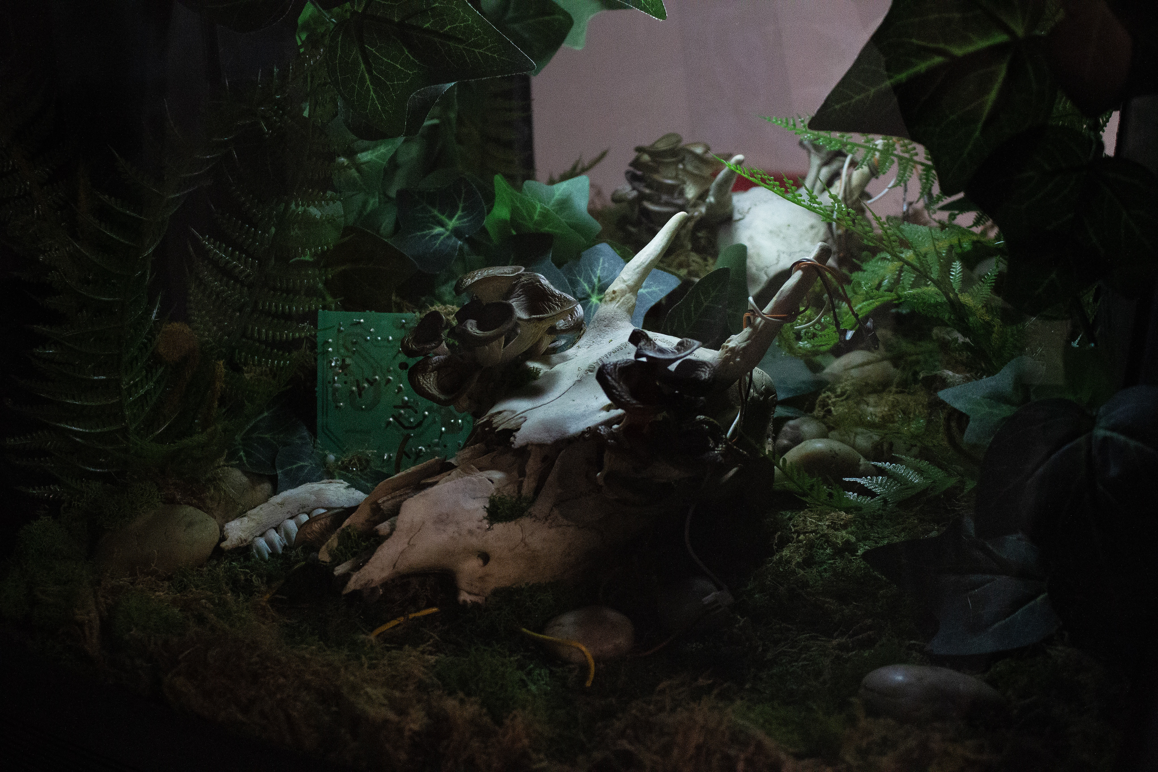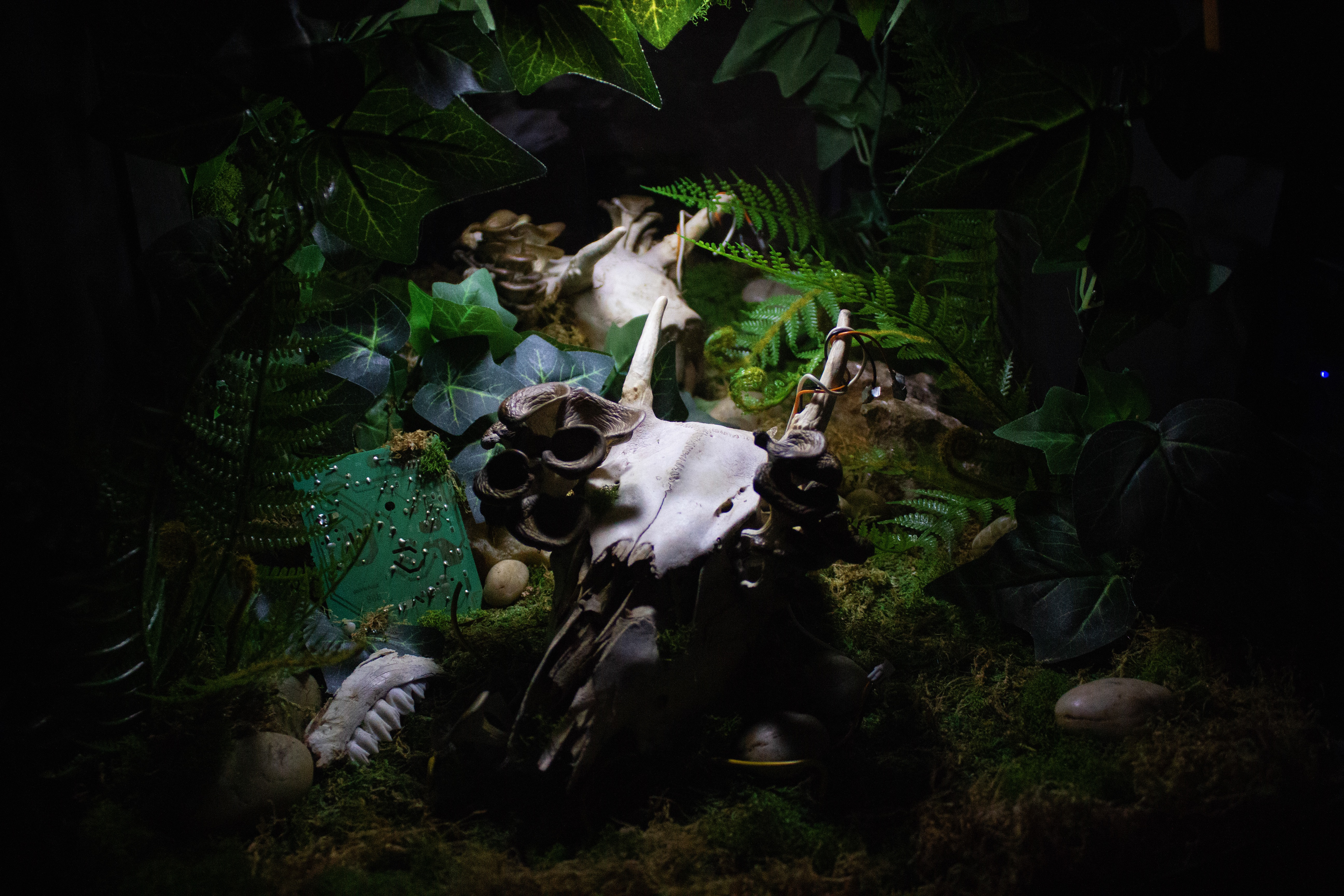 The sculptural piece Digital Decay invites viewers into a scene frozen in time that shows the mysterious and unpredictable period after death. Oftentimes, the products of dying are overshadowed by the actual event itself. However, this period is just as important and sometimes strangely beautiful. The television set and the scene inside bridge the gap between technological and organic - both static and ephemeral. It questions: after life, what is gone, what remains, and what is to come? This piece includes manmade and found objects, including a television, wiring, and a deer skull, as well as natural components like moss and mushrooms.