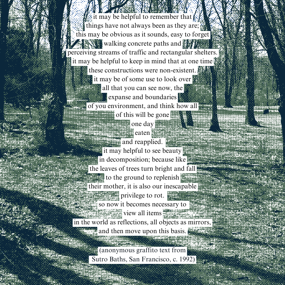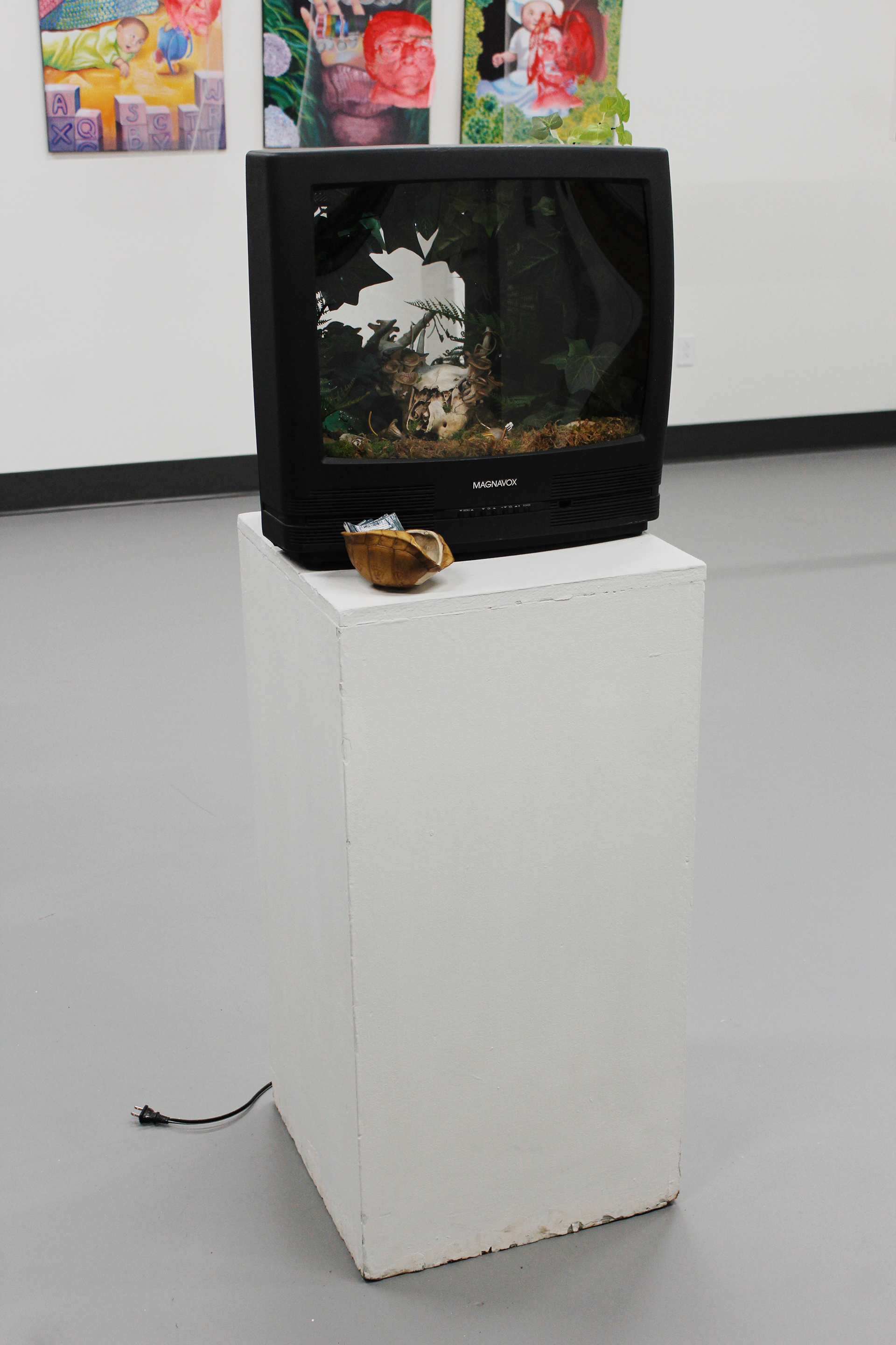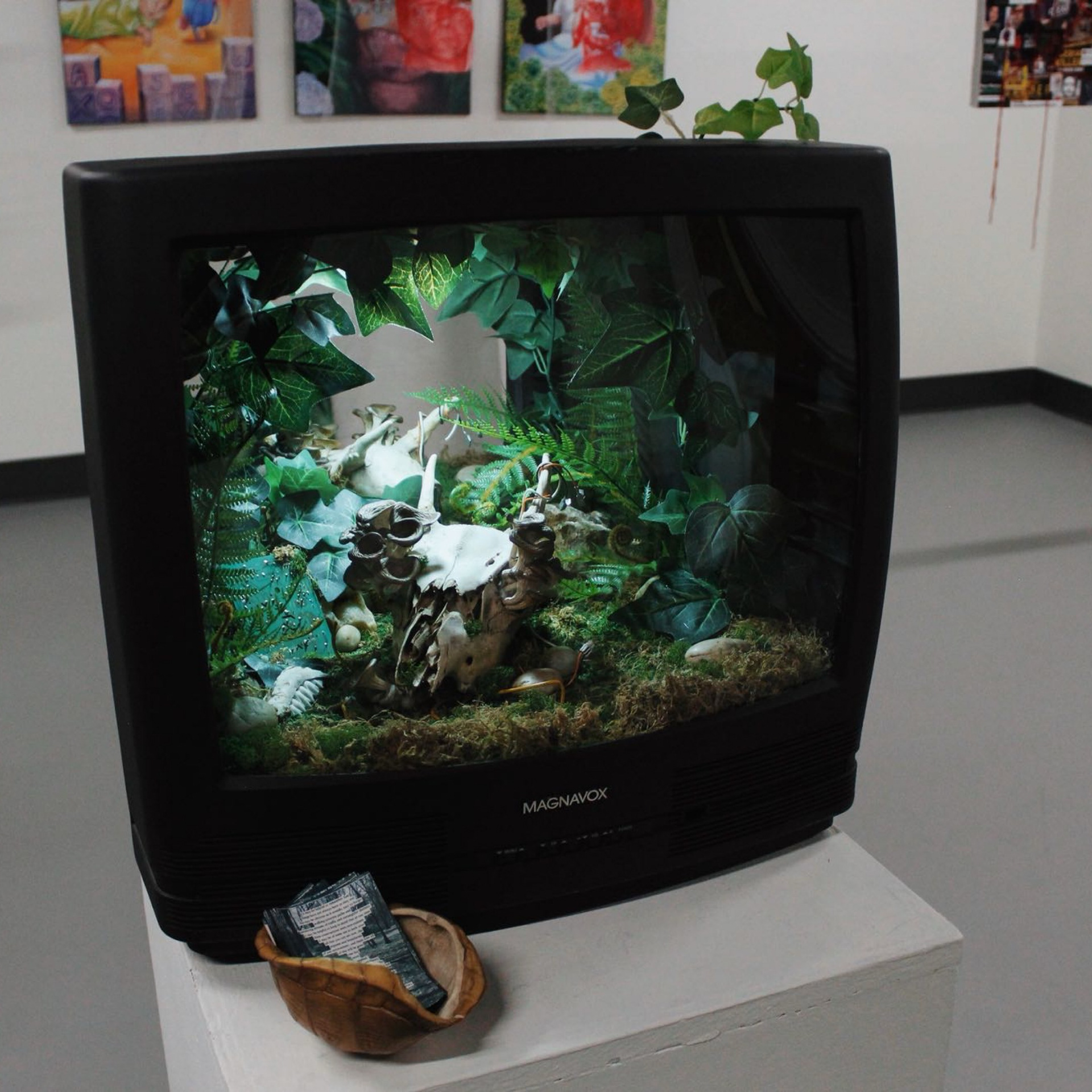 The sculptural piece Digital Decay invites viewers into a scene frozen in time that shows the mysterious and unpredictable period after death. Oftentimes, the products of dying are overshadowed by the actual event itself. However, this period is just as important and sometimes strangely beautiful. The television set and the scene inside bridge the gap between technological and organic - both static and ephemeral. It questions: after life, what is gone, what remains, and what is to come? This piece includes manmade and found objects, including a television, wiring, and a deer skull, as well as natural components like moss and mushrooms.