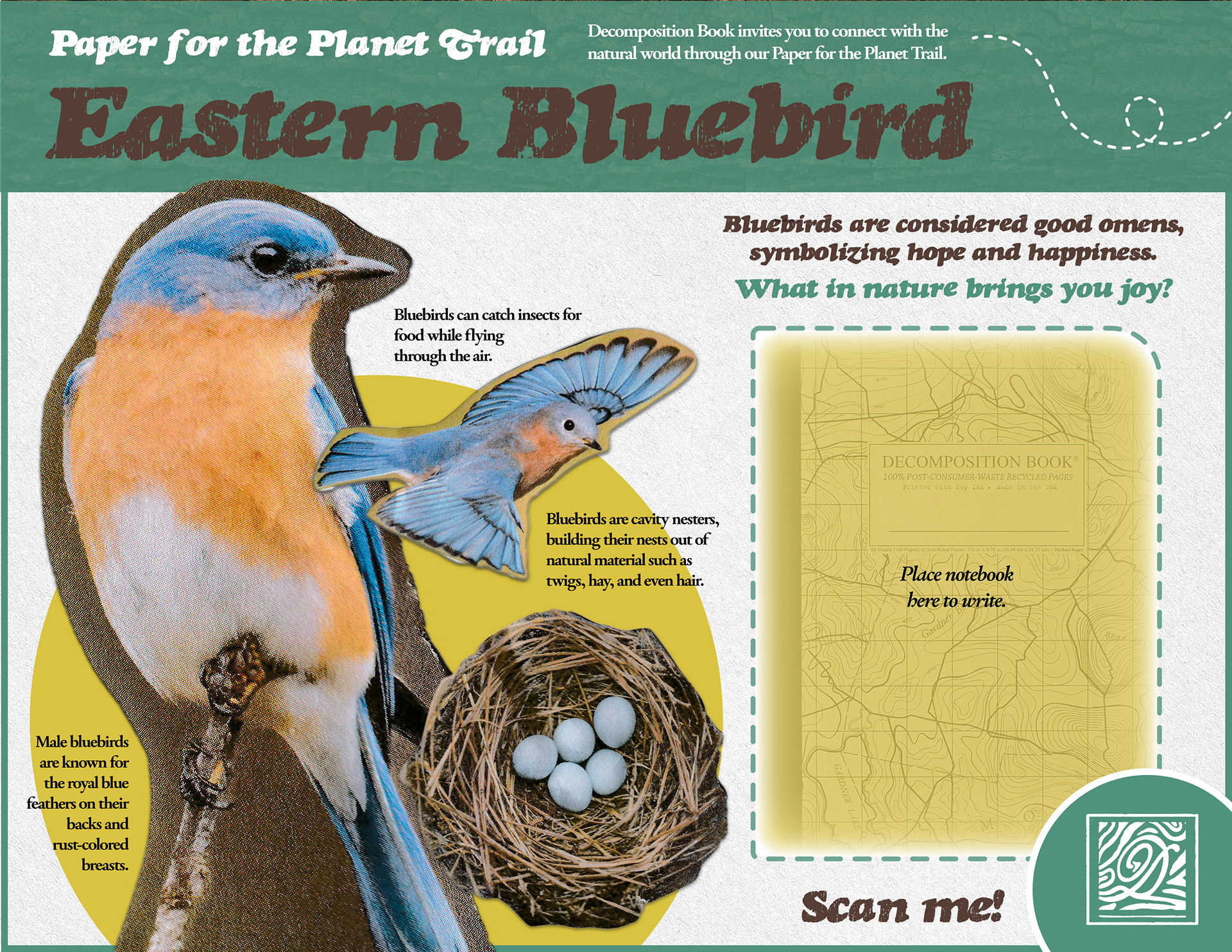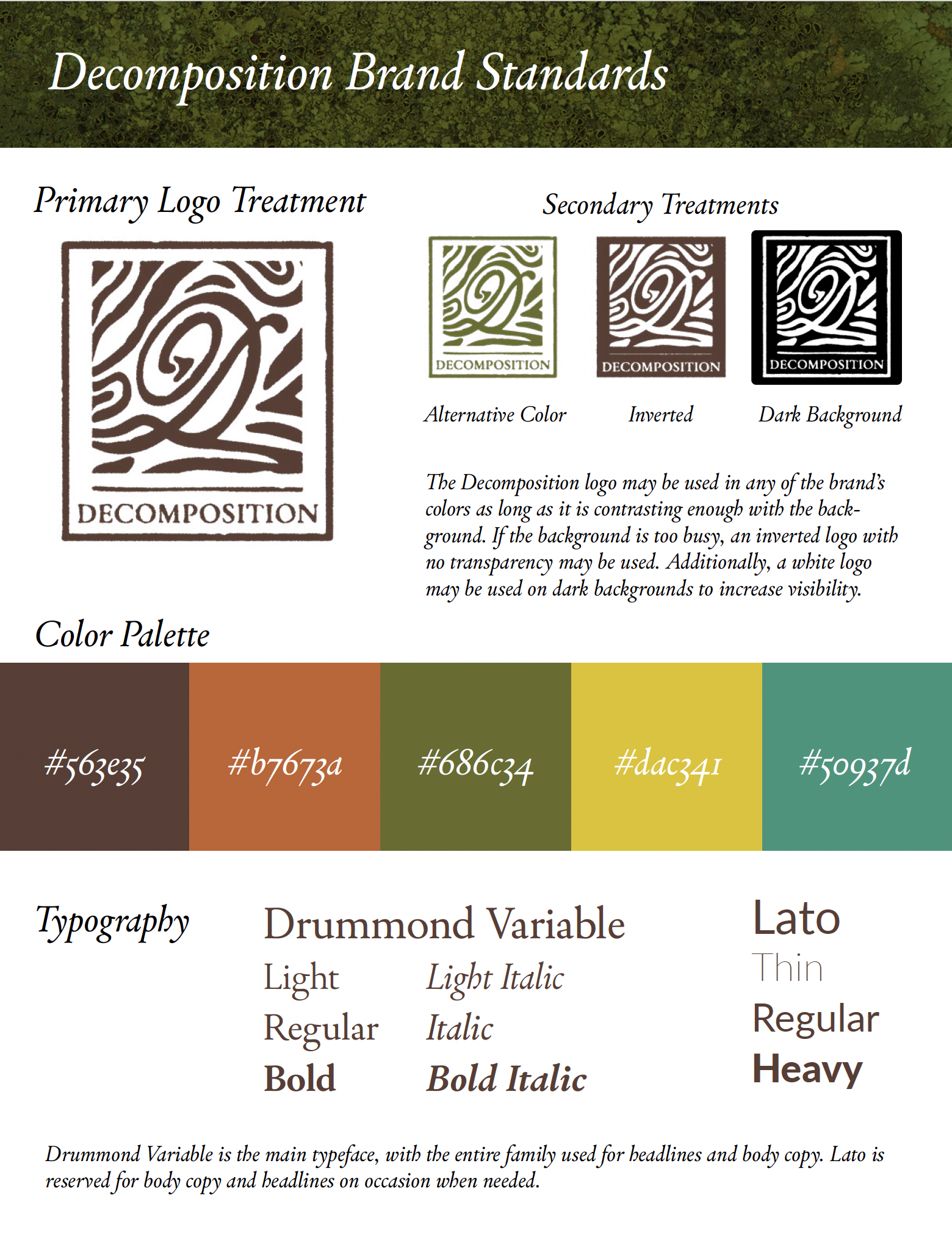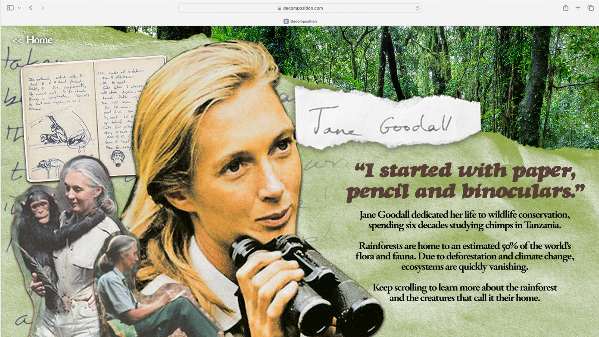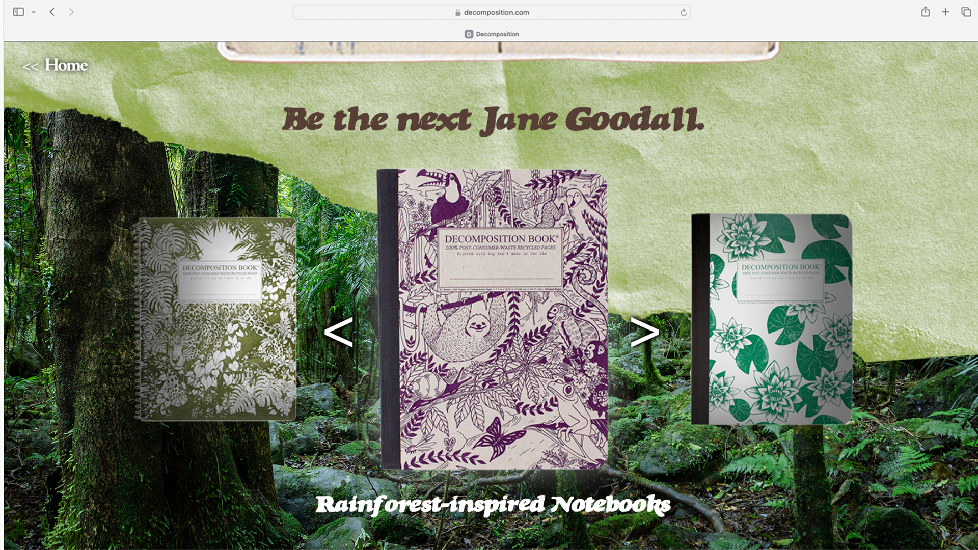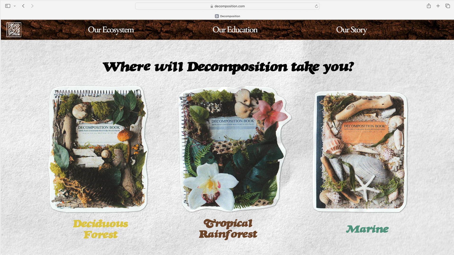 In a design class, I was tasked with picking a brand to reimagine and create a campaign for. I chose Decomposition Notebooks, a company that produces 100% post-consumer waste notebooks. For the campaign, I decided to focus on educating consumers about different environments most affected by deforestation and climate change.