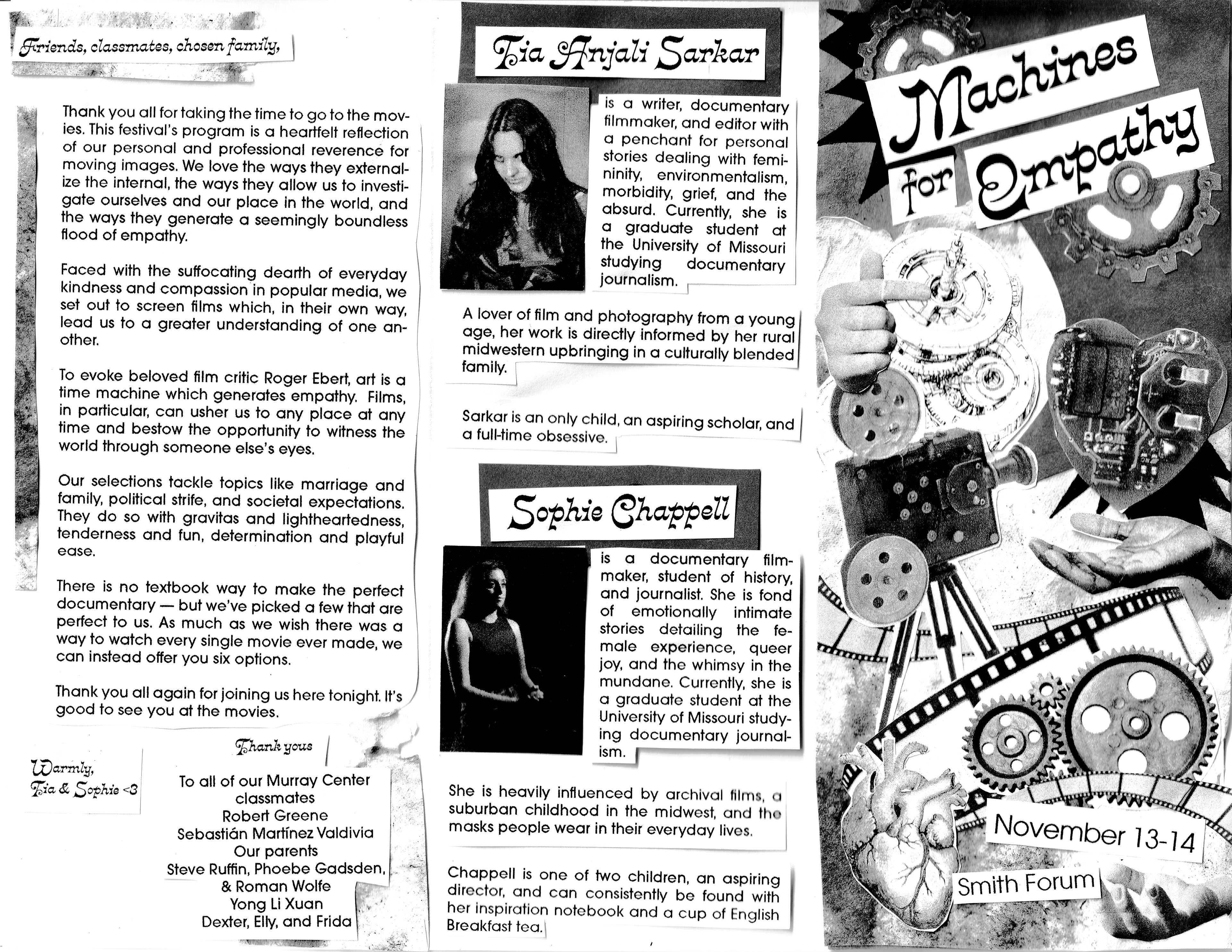 I was asked to create a brochure zine for a student-led film festival at the University of Missouri. Movies shown revolved around a central idea of human connection and understanding. I physically collaged elements of the zine before scanning the masters in and riso printing. Overall, 40 of these zines were distributed to attendees,